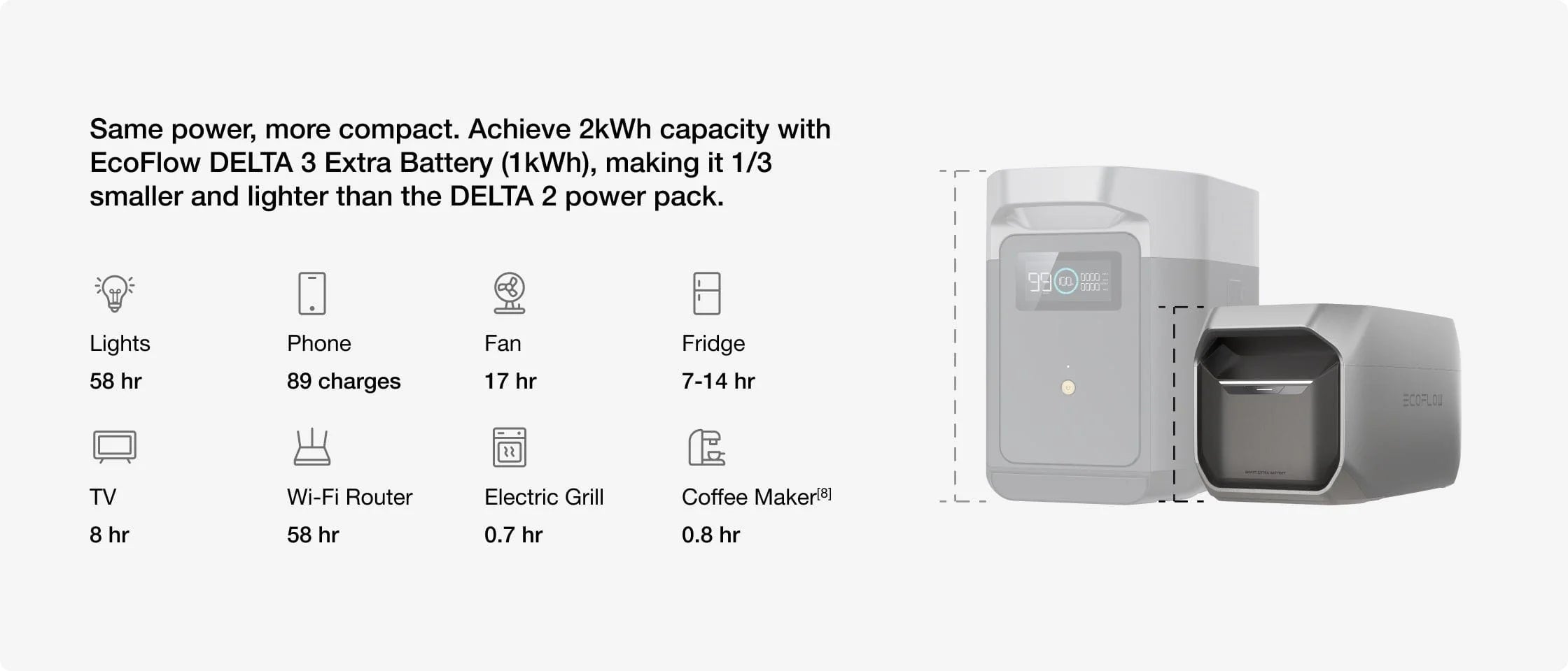 • Extra Battery: Expandable capacity to 5kWh | DELTA 2 MAX/DELTA 2/DELTA P ro3/DELTA 3 Extra Battery Supported