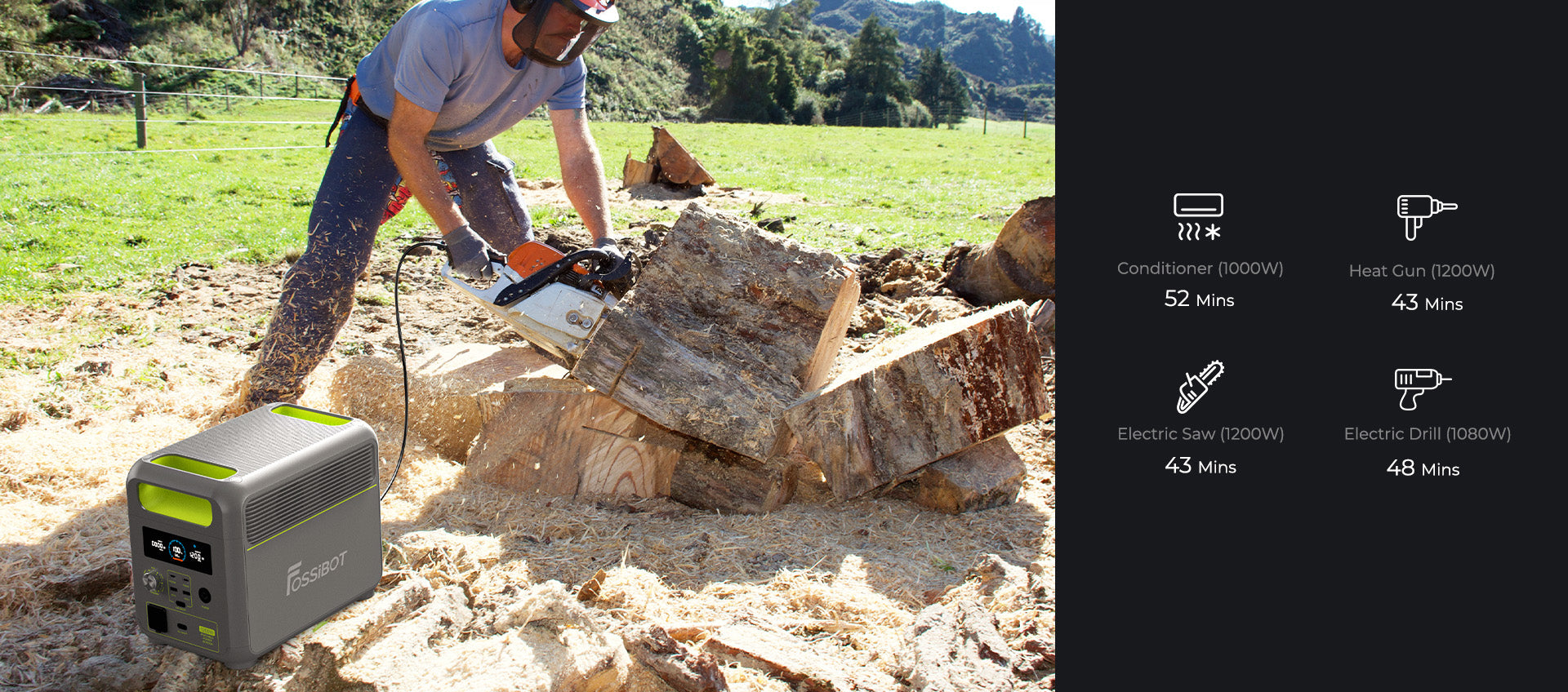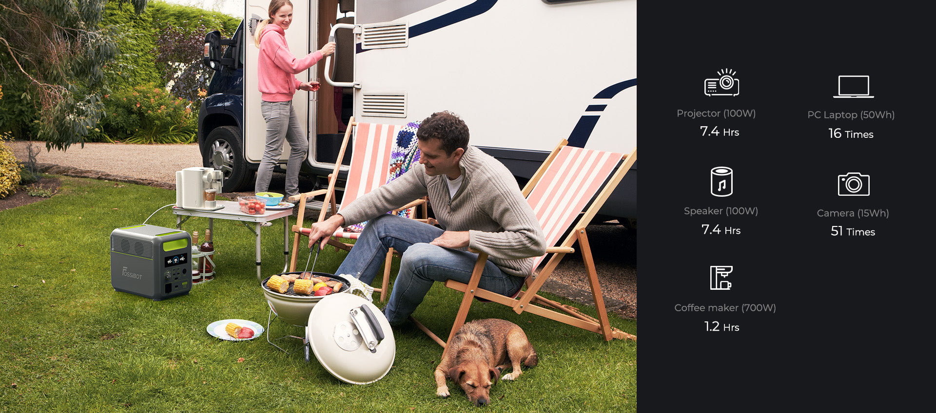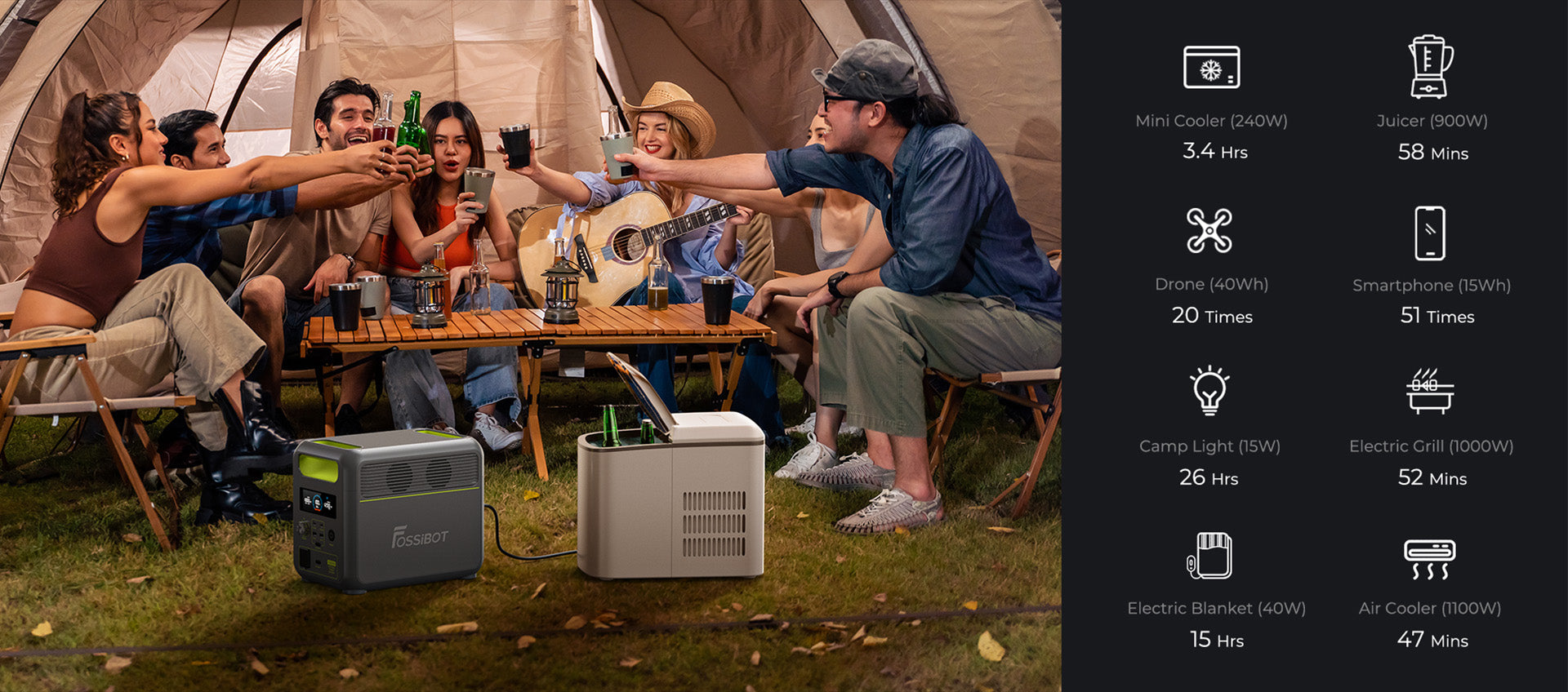 Bringen Sie mit dem FOSSiBOT F1200 Schwung in die Party! Sein 1.024-Wh-Akku und die konstante 1.200-W-Stromversorgung versorgen Lautsprecher, Gitarre und Kühler mit Strom und sorgen so für eine lebendige und coole Party.