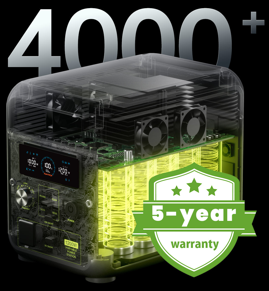 Der FOSSiBOT F1200 wird von einer LiFePO4-Batterie mit hoher Kapazität angetrieben und gewährleistet sowohl Sicherheit als auch lange Haltbarkeit mit über 4.000 Zyklen bis zu 80 % Kapazität.